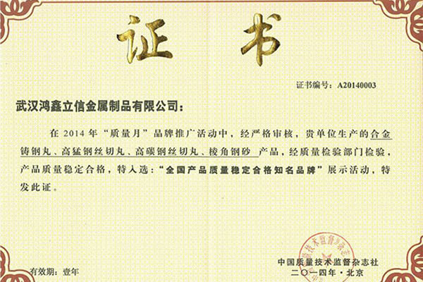 公司所有產品均通過ISO9001 **質量認證,2014年更獲得了第三屆中國金屬磨料行業具有影響力品牌-華尊獎